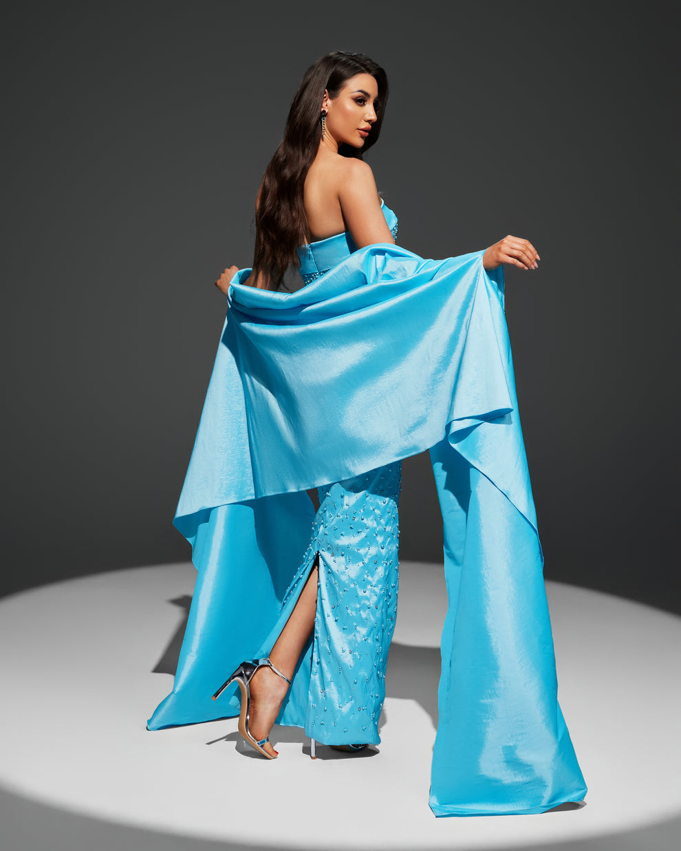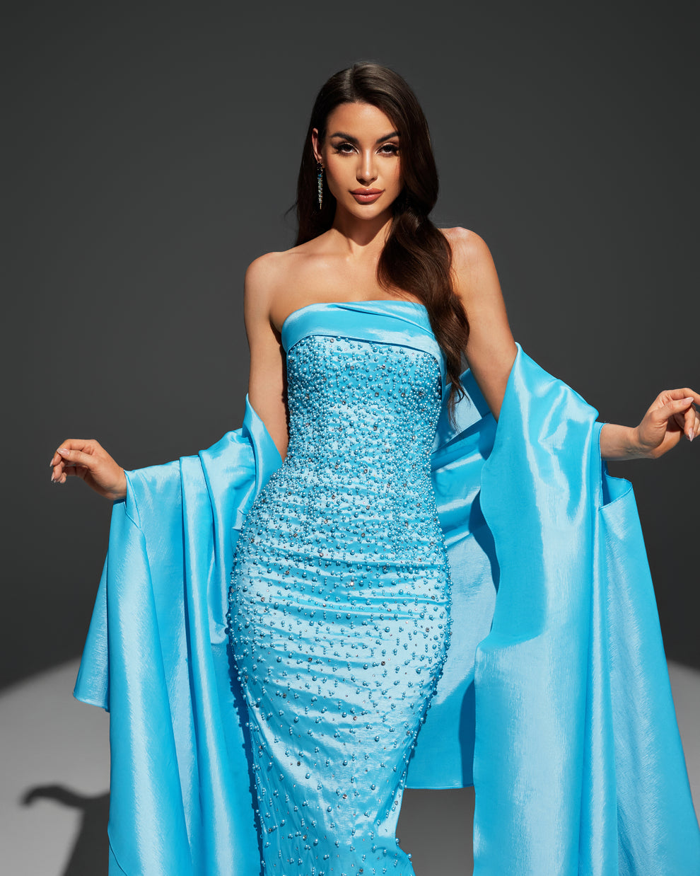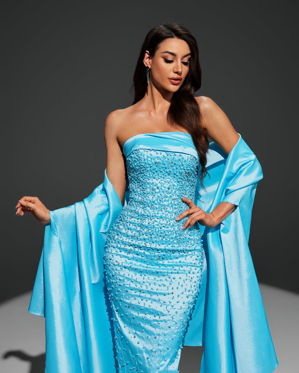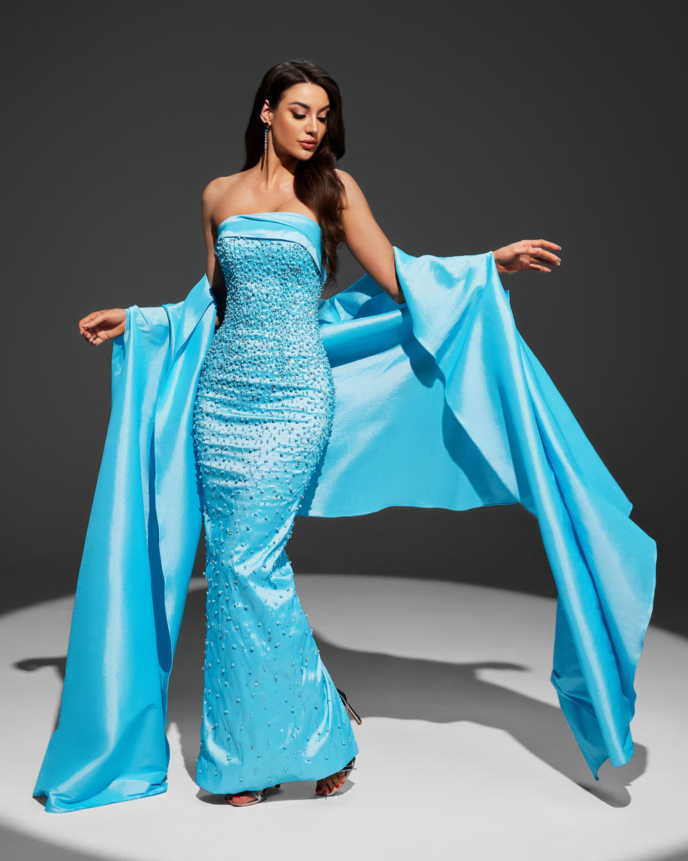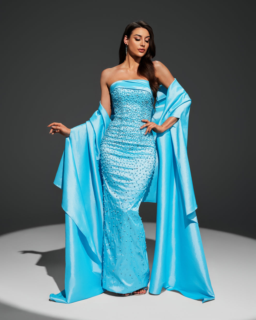 🌙 يتميز بكتف مكشوف “سترابلس” مع شال طويل فاخر من نفس القماش لإطلالة ملكية تخطف الأنظار.