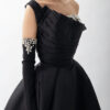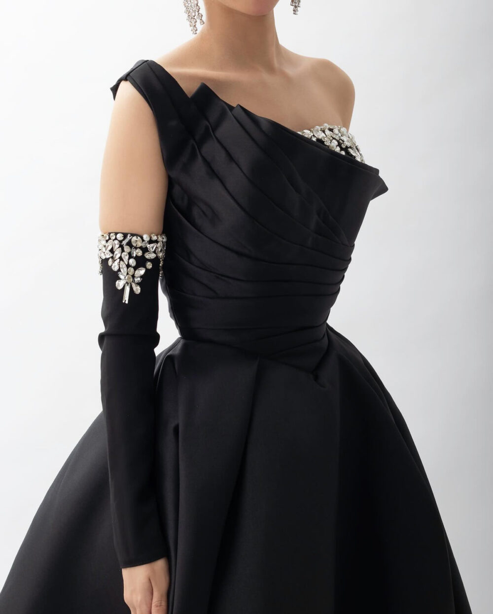 فستان سهرة أسود بكتف واحد وتفاصيل كريستالية – أناقة لا تضاهى وفخامة مرصوفة على قماش